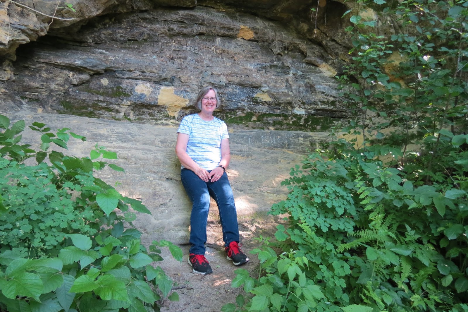 Then we came to a staircase. And I use that term generously here. These were more or less flat rocks stacked in succession, so as to form something similar to stairs that would help in continuing. Perhaps more work of the CCC. We actually weren't sure, when we first came upon them, that they really were where the trail went because there was also something that looked like a trail leading up the other direction and along the bluff. But in the end we decided to go down them and, sure enough, there was a marker at the bottom showing that this really was the trail.